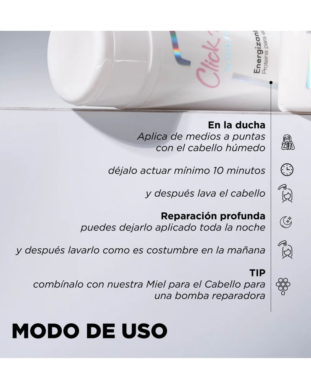 • Repolarizaciones: Mezcla con unas gotas de Miel Capilar para potenciar la reparación y la hidratación.
