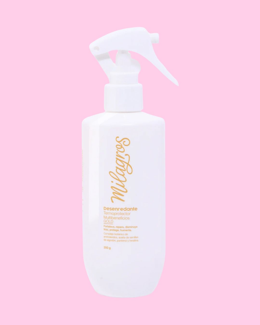 El Desenredante Termoprotector Multibeneficios Gold de la línea Milagros es un spray / tratamiento multifuncional que combina poder desenredante con protección térmica avanzada (hasta 230 °C). Su fórmula está pensada para facilitar el peinado, minimizar el frizz y proteger el cabello frente al uso de herramientas de calor, sin dejar sensación pesada.