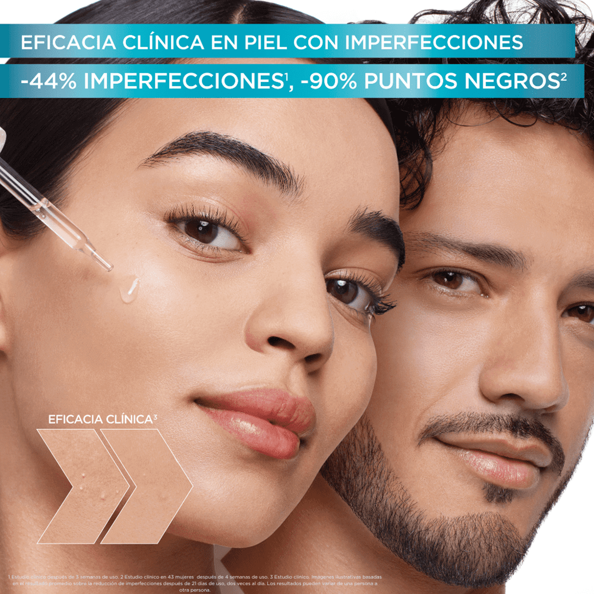 Clínicamente, se reporta que este sérum puede reducir imperfecciones en un -44 % y puntos negros en un -90 % en pruebas controladas.
