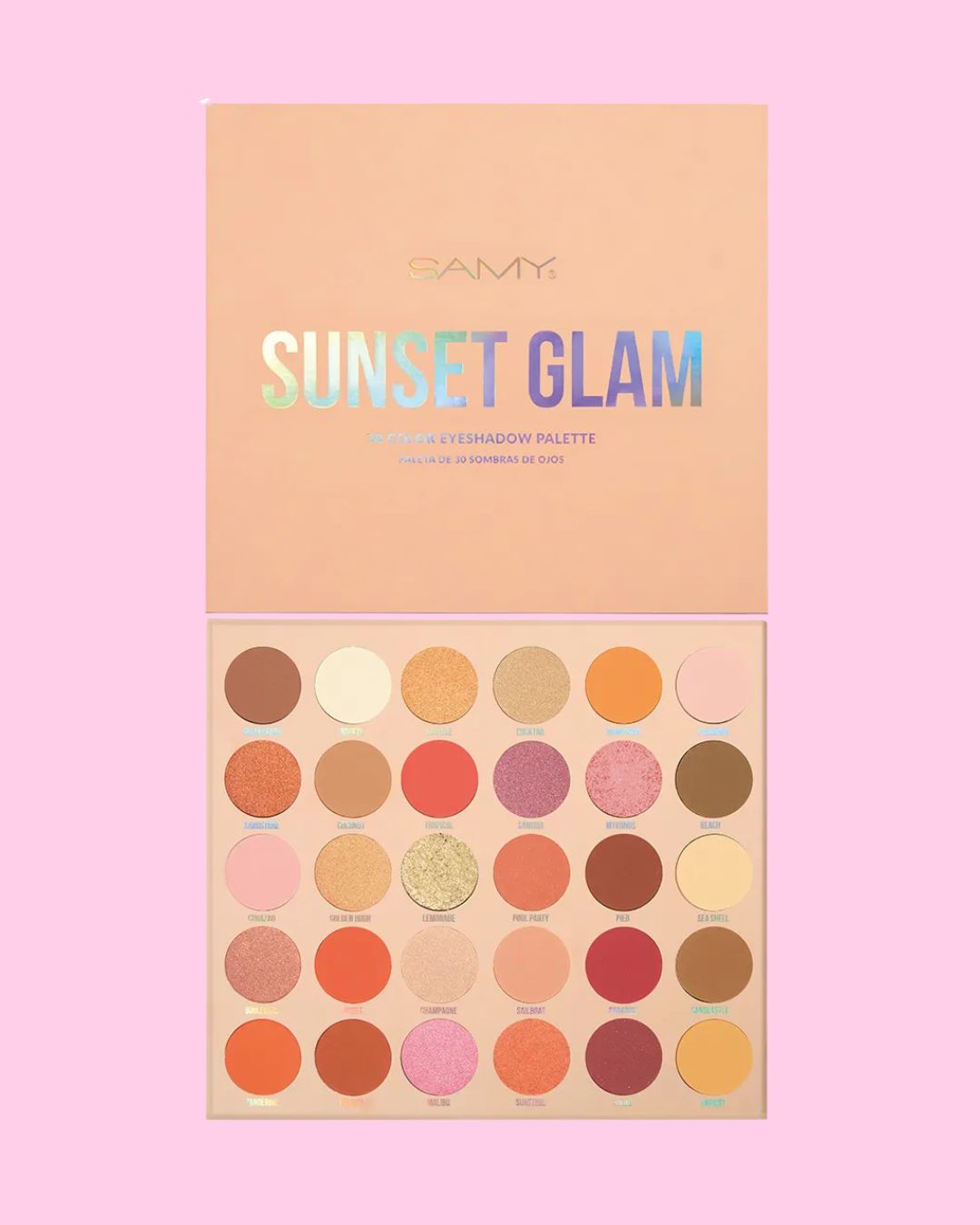 La Paleta de Sombras Sunset Glam de Samy te invita a vivir el atardecer en tu mirada. Inspirada en los tonos cálidos y luminosos del ocaso, combina 30 sombras de alta pigmentación con acabados mates, satinados y metálicos, ideales para crear desde looks naturales hasta maquillajes glamorosos e intensos.