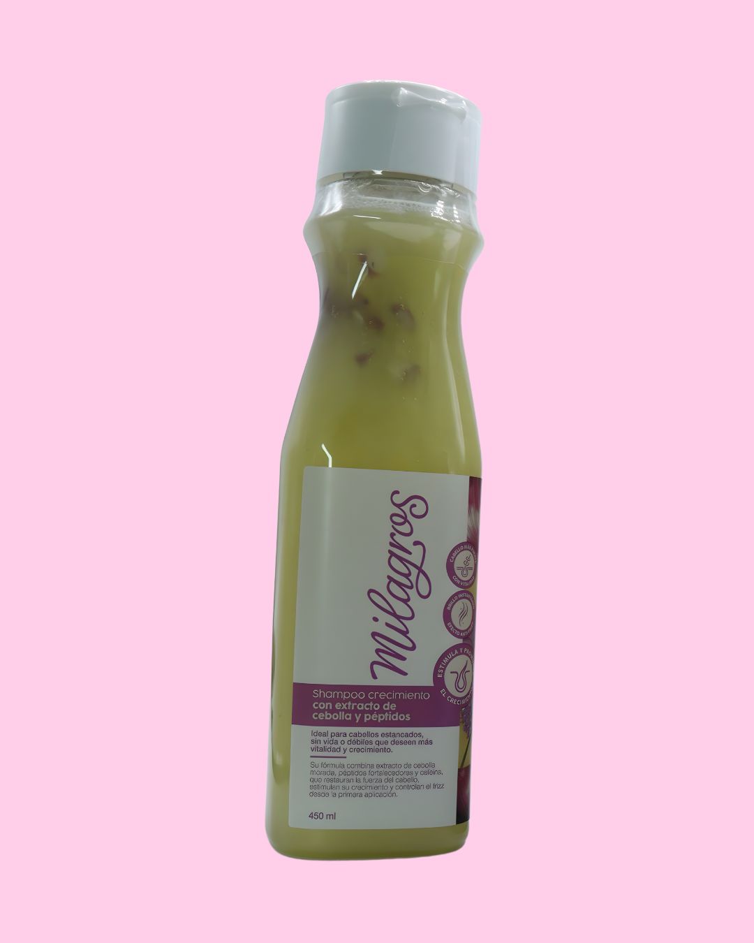 El Shampoo Crecimiento con Extracto de Cebolla y Péptidos de Milagros es un tratamiento capilar formulado para estimular el crecimiento, fortalecer la raíz y reducir la caída del cabello desde el primer uso.